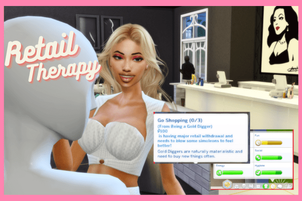 The retail therapy whim is a fun and indulgent activity for Gold Diggers in The Sims. When their fun need is running low, they seek solace in shopping. Taking your Sim to a retail lot and spending some simoleons on purchases not only fulfills their fun need but also allows them to earn aspiration points. By completing three purchases or interactions with the thrift store retail rack, your Sim can satisfy their desire for retail therapy and enjoy the rewards that come with it.